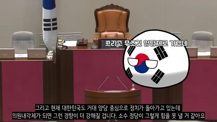 하지만 한국의 경우 급격하게 성장하면서 그렇게까지 시민의식 수준이 높은 나라라고 하기엔 무리가 있습니다. 자칫 잘못하면 오히려 대통령제가 있을 때보다 내리막을 걸을 수도 있습니다. 즉 한국이 의원내각제를 채택할 경우 파급효과가 긍정적이라고 말하기에는 아직 이르다는 것입니다.