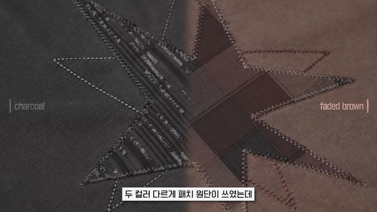 이 티셔츠는 빈티지 캐주얼을 좋아하는 MZ세대의 취향을 저격한 아이템입니다. 기본적인 적당히 루즈한 핏에 앞판의 큼직한 스타 패치와 자수 디테일이 포인트입니다. 두 가지 서로 다른 패치 원단이 사용되어 디테일에 신경을 많이 쓴 것을 알 수 있습니다.