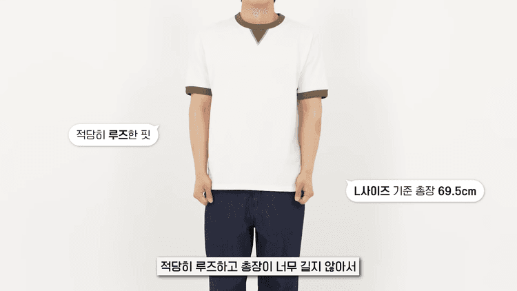 적당히 루즈하고 총장이 너무 길지 않아서 트렌디하게 다리 길이를 살리면서 착용할 수 있습니다. 네이비와 올리브는 클래식한 컬러인 만큼 치노 반바지와 함께 깔끔하고 캐주얼하게 매치하기 좋습니다. 개인적으로 링거 티셔츠가 부담스러웠던 분들도 이 삼각형 디테일 때문에 살짝 스웨터 같은 느낌이 나서 도전해볼 만한 아이템입니다.