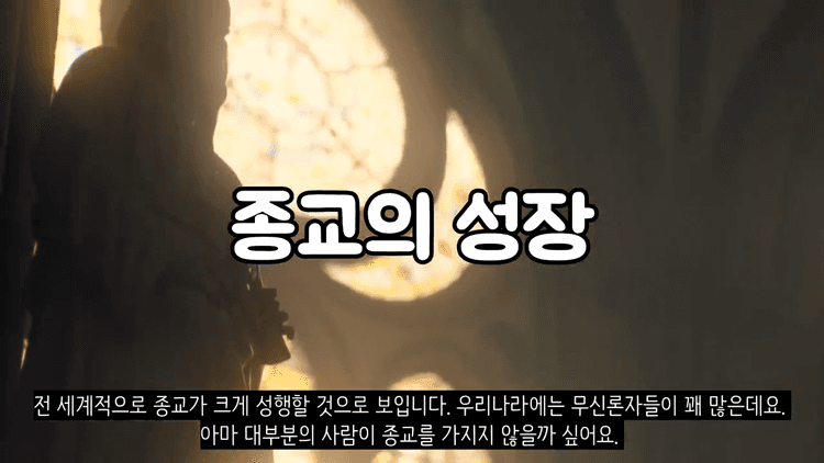 이렇게 되면 전 세계적으로 종교가 크게 성행할 것이며, 어떤 나라들은 신정국가로 바뀌는 경우도 분명히 있을 것입니다. 예를 들어 우리나라에는 무신론자들이 꽤 많은데, 아마 대부분의 사람이 종교를 가지게 될 것입니다. 종교를 믿어서 죽음 이후에 안락한 생활을 하기 위해서 말입니다.