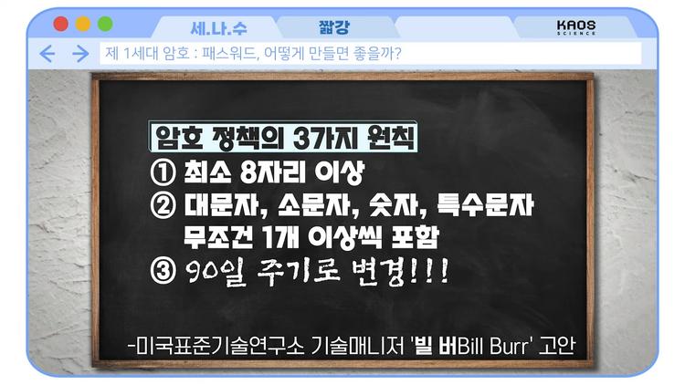 그런데 왜 수많은 사이트들에서는 계속해서 "이제 바꿀 때가 되었습니다. 바꾸세요"라고 귀찮게 할까요? 실제로 초기에 패스워드에 대한 규칙을 만드는 연구자가 90일에 1번씩 바꾸라는 룰을 만들어서 배포했었는데, 굉장히 오랜 시간이 지났음에도 사람들이 그 룰이 전파되어 따르면서 그런 일이 일어났습니다. 그걸 처음 만든 분은 후회한다는 인터뷰도 했습니다만, 이미 너무 세상에서 많이 사용되고 있는 상황입니다.