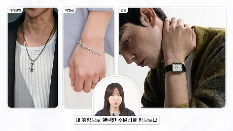 남자분들은 과하지 않는 주얼리로 입문해 보는 것을 추천합니다. 화려한 주얼리보다는 심플한 주얼리 위주로 착용하는 것이 좋습니다. 이렇게 심플한 것들로 나만의 느낌, 내 취향으로 선택한 주얼리를 착용함으로써 내 코디가 한껏 달라집니다. 주얼리가 부담스럽다면 시계 같은 아이템도 좋은 대안입니다.