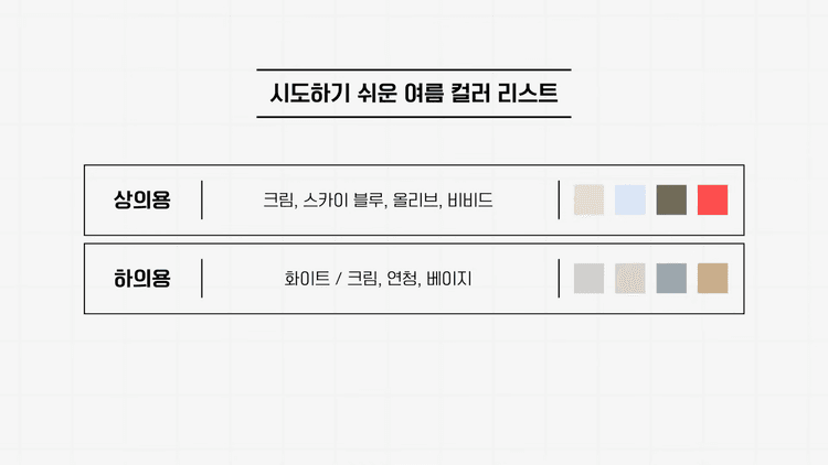 어두운 컬러는 깔끔하고 시크해 보여서 좋기는 하지만, 톤을 밝혀주면 답답해 보이지 않고 시원해 보일 수 있습니다. 여름에 더워 보이고 싶지는 않으니까요.