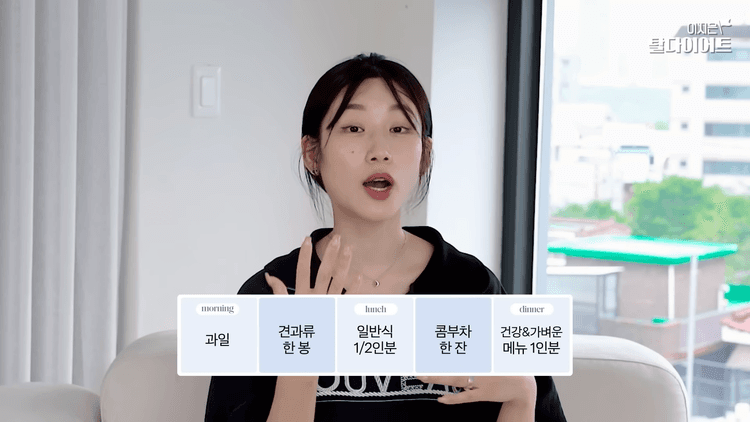오늘의 팁을 모두 적용한 추천 식사 플랜은 다음과 같습니다. 기상 직후 오전 시간에 공복감을 느낄 경우, 과일을 섭취하는 것이 권장드립니다. 이후에도 배고픔이 지속될 경우에는 견과류 한 봉지를 섭취하는 것이 좋습니다. 점심 식사는 개인의 기호에 따라 일반식으로 한 사람 분량을 섭취하며, 식사 후 입이 심심할 때에는 콤부차 한 잔을 마시는 것이 도움이 될 수 있습니다. 저녁 식사는 가급적 가볍고 건강한 메뉴를 선택하여 1인분 정도 섭취하는 것이 이상적입니다. 이 영상을 보시는 모든 분들이 가장 건강하고 행복할 수 있는 나만의 자기 관리 방법을 찾으시길 바랍니다.