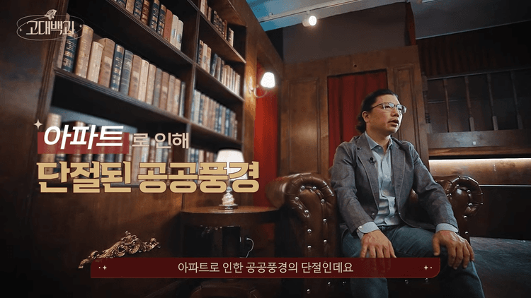 한국의 도시 환경에서 공공 영역이 활성화되지 못한 여러 원인 중 하나는 대규모 아파트 단지입니다. 아파트로 인해 공공 풍경이 단절되고 있습니다.