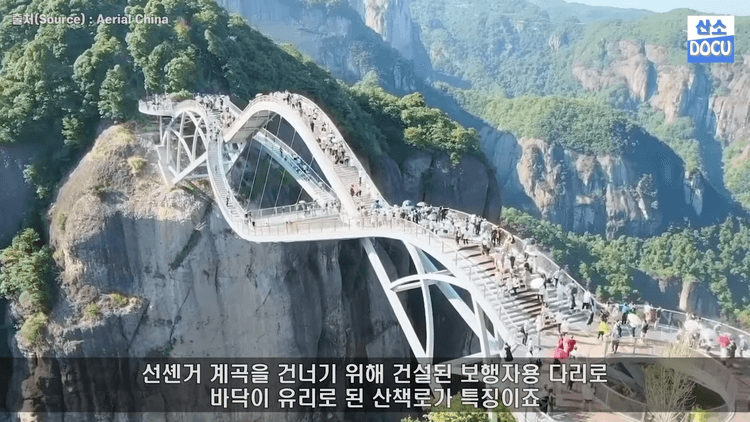 중국의 여의교는 중국 저장성 타이저우에 있는 인도교로 세 개의 다리로 이루어져 있습니다. 천생거 계곡을 건너기 위해 건설된 보행자용 다리로 바닥이 유리로 된 산책로가 특징입니다. 특이한 곡선 통로는 중국에서 행운을 뜻하는 장신구 여의에서 영감을 얻었습니다.