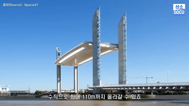 프랑스의 쟈끄 샤벙 델마 다리는 2013년 프랑스 보르도의 가론강을 가로질러 완공한 수직 리프트 다리입니다. 다리의 중앙 부분은 일체형으로 유지되지만 높이가 높은 선박이 다리 아래로 지나갈 수 있도록 수직으로 최대 110미터까지 올라갈 수 있습니다.