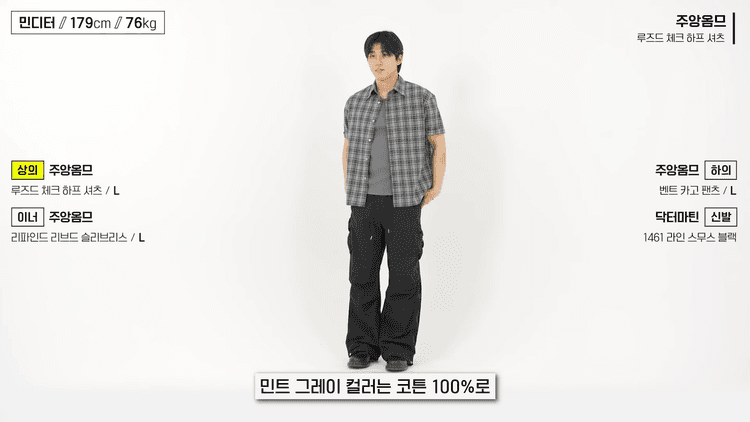 스타일링은 그저 평소 입던 롱슬리브 룩을 헨리넥 반팔로 바꿔주기만 하면 됩니다. 헨리넥 특유의 남성적인 이미지가 깔끔한 룩에 잘 어울리며, 단추를 한두 개 정도 풀어주면 더욱 시원한 느낌을 연출할 수 있습니다. 핏은 레귤러에서 세미 오버 중간 정도로 어깨선도 너무 많이 내려오지 않아 체형 보완에 도움이 됩니다.