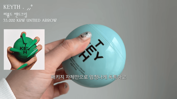첫 번째는 키쓰 핸드크림입니다. 외형 자체가 굉장히 트렌디하고 똑똑한 느낌이어서 밖에서 발랐을 때 정말 많은 질문을 받았던 제품입니다. 뒤쪽 뚜껑을 따서 짜서 사용하는 형태이고, 향별로 색깔이 다양합니다. 민트 컬러 제품의 경우 기분 좋은 포근한 빨래 향이 느껴지며, 텍스처는 가벼운 편으로 꾸덕하기보다는 밀키하게 잘 스며드는 특징이 있습니다.