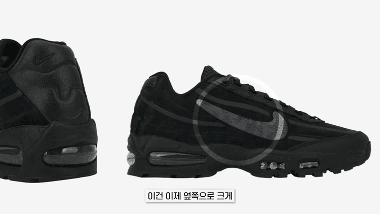 워크스 아웃 x 나이키 에어맥스 95 제품을 우선 추천드리고 싶습니다. 기존에 있던 에어맥스와 실루엣은 거의 유사한데, 일반 에어맥스 95는 나이키 스우시가 뒤쪽에 조그맣게 들어가 있는데 이 제품은 옆쪽으로 크게 대신 튀지 않게 들어가 있어서 무난하게 활용할 수 있어요. 블랙, 올리브 2가지 컬러인데 요즘 브라운 계열도 트렌드이고 빈티지한 것도 트렌디하잖아요. 그래서 올리브가 좀 더 예뻐 보였습니다.