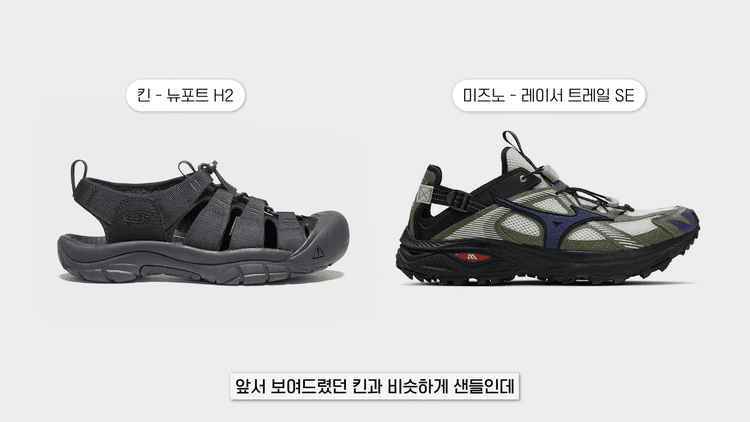 미즈노의 Racer Trail SE도 좋은 제품인데요, 앞서 보여드렸던 킨과 비슷하게 샌들인데 옆쪽이 메시 소재로 막혀 있고 착화감이 거의 스니커즈라고 생각하시면 돼요. 이 제품은 재미있게도 국내에서 발매된 적이 없는데 크림에서 판매는 되고 있어요. 실물 사진도 예쁘고 후기도 가볍고 편하다는 게 많아서 저도 장바구니에 담아놓은 제품입니다.
