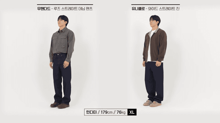 마지막은 데님 팬츠 2종으로 둘 다 생지 데님 스타일로 준비했습니다. 유니클로는 부드럽고 유연해서 편안한 착용감이 좋은 제품으로, 빳빳한 데님보다는 데님과 치노 그 사이의 느낌입니다. 디자인도 핏감도 군더더기 없이 쭉 떨어지면서 좀 더 와이드한 실루엣으로, 워낙 사이즈가 세세하게 나뉘어져 있다 보니 원하는 핏감에 따라 사이즈 업다운을 할 수 있는 장점이 있습니다.