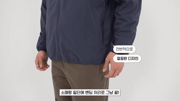 반면 유니클로는 좀 더 점잖고 미니멀한 느낌이 물씬 납니다. 폴리 원단으로 마찬가지로 엄청 얇고 유연한 느낌인데 살짝 촉촉한 느낌이 있어 나일론 바람막이를 입었을 때 바스락거리는 소리가 싫다면 이 제품을 좋아할 수 있습니다. 디자인도 좀 더 깔끔하게 소매랑 밑단에 밴딩 처리로 마감했고, 포켓도 지퍼 포켓으로 옆선을 따라 히든 처리해줬습니다. 비즈니스 캐주얼 룩을 입는 직장인들이 회사에 하나 두고 에어컨이 강할 때 입으면 좋을 것 같습니다.