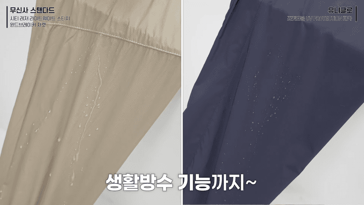 첫 번째 비교 아이템은 바람막이입니다. 바람막이는 초여름까지 활용하기도 좋고 장마 시즌에 실내 에어컨 때문에 감기 걸리기 쉬운 상황에서 유용합니다. 일단 둘 다 경량으로 나와서 휴대하기도 좋고 굉장히 가벼우며, 생활 방수 기능까지 있습니다.