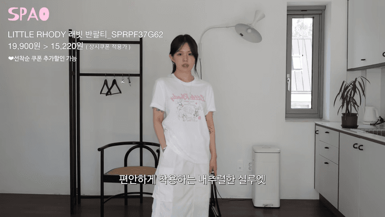 네 번째 룩은 여름에 진짜 편한 코디의 정석으로 준비한 후들후들한 티셔츠에 카고 스커트 조합입니다. 티셔츠의 레터링이 너무 귀여운데, 귀여운 토끼가 콕콕 박혀 있습니다. 착용했을 때 살짝 여유감이 도는 루즈핏 실루엣이기 때문에 딱 입었을 때 군살을 커버하면서 편하게 착용이 가능합니다. 원단은 탄탄한 코튼 원단이어서 오래 입기도 괜찮고 너무 흐물거리지 않아서 좋습니다. 컬러는 세 가지 선택지가 있습니다.