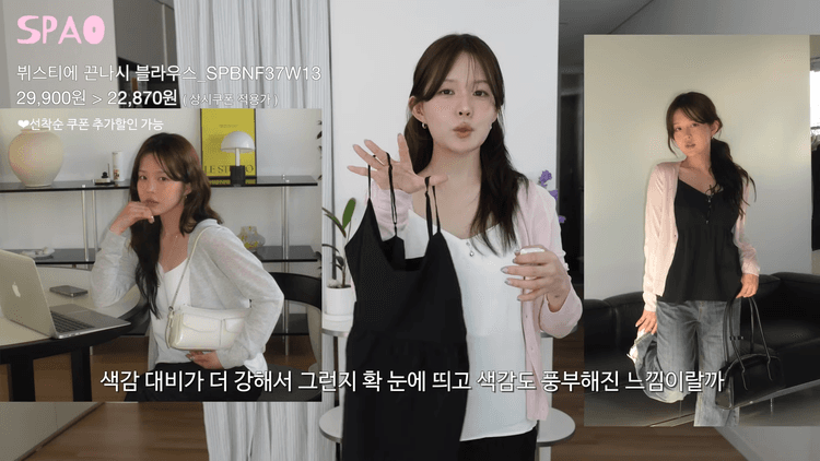 이 코디에 저는 셔링 이너 블라우스를 함께 코디했습니다. 기본템이라서 컬러 고민이 들 것 같은데요, 블랙이 조금 더 활용도가 좋습니다. 해당 블랙 컬러는 다크 인디고 데님과도 잘 어울리는데요, 빈티지하게 노란 빛이 돌아서 힙한 느낌을 줍니다. 여름 철에 가디건에 입는 것도 잘 어울리지만, 큰 티셔츠에 바지 하나만 입어도 잘 어울릴 것 같습니다.
