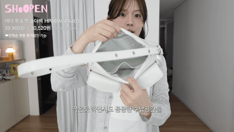 가방은 레더 투포켓 숄더백을 착용했는데, 데일리로 사용하기에 좋은 가방입니다. 숄더 끈에 들어간 아일렛 포인트가 상당히 귀엽습니다. 사이즈가 작은 것 같아 보여도, 수납력이 좋은 가방입니다. 광택이 은은하여 실제 가격보다 퀄리티가 좋아보여, 추천드립니다.
