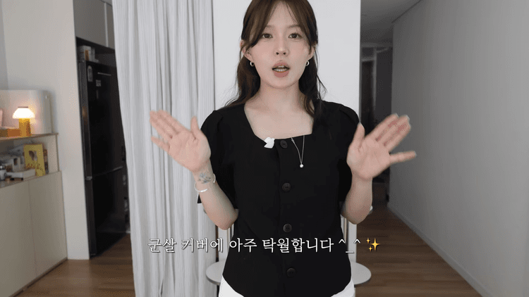 단정하게 클로징하고 안에 깔끔한 이너만 입어도 출근룩으로 활용 가능하지만, 포인트를 더 주고자 셔링 디테일이 들어간 코튼 블라우스를 이너로 함께 착용했습니다. 탄탄한 원단에 살짝 바스락거리는 코튼 소재로, 단독으로 착용하기에도 노출 부담 없이 시원한 느낌입니다. 넥라인은 넓은 브이라인으로 나와 있고, 가슴 밑으로 셔링이 살짝 퍼지는 A라인이라 뱃살 커버가 가능합니다. 나중에는 반팔 티셔츠 위에 레이어링해도 예쁠 것 같습니다.