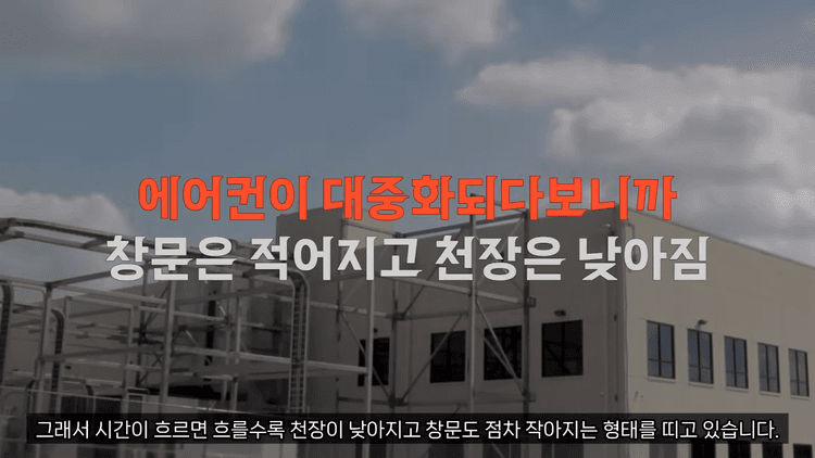그런데 시간이 흐르면 흐를수록 건축물은 천장이 낮아지고 창문도 점차 작아지는 형태를 띠게 되었습니다. 그래서 1940년대에서 50년대 지어진 건물과 지금의 건물을 비교하면 미묘하게 차이가 있죠. 아마 에어컨이 개발되지 않았다면 지금도 천장이 높고 창문이 많은 집에서 살고 있었을 것입니다.