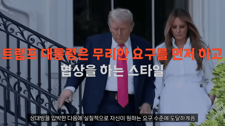트럼프 대통령은 협상에서 가장 높은 수위의 요구 조건을 먼저 꺼내서 상대방을 압박한 다음에, 실질적으로 자신이 원하는 요구 수준에 도달하게끔 상대를 끌어들이는 전략을 자주 사용합니다. 상대가 위협을 심각하게 받아들이고 양보할 수밖에 없는 심리적 상태를 만드는 방식입니다.