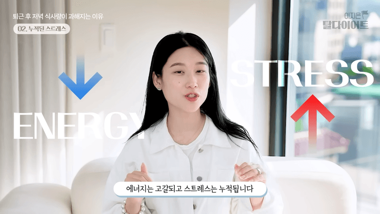 퇴근 후 입이 터진다면 혹은 저녁 식사에서 매번 과식한다면 원인은 식욕이 아닌 누적된 스트레스에 있습니다. 하루를 보내는 동안 누적된 스트레스를 보상받기 위해 저녁 먹방이 발생하는 것입니다. 만약 일주일에 3일 이상 저녁 과식 혹은 저녁 폭식을 하고 있다면, 올바른 방법으로 즐거운 저녁 식사와 체중 감량 모두 성공할 수 있습니다.