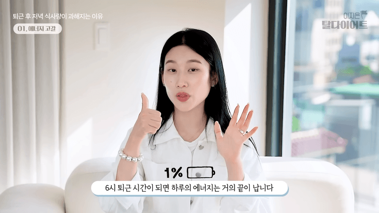 에너지를 미리 아껴 쓰지 않는 이상 6시 퇴근 시간이 되면 하루의 에너지는 거의 끝이 납니다. 이때 6시에서 7시 힘든 퇴근길까지 겪고 에너지가 초과 사용되면 퇴근 후 집에 도착해서 고갈된 에너지를 보충하기 위해 많은 양의 음식을 먹어서 고갈된 에너지를 보충하고 싶어지는 것입니다.