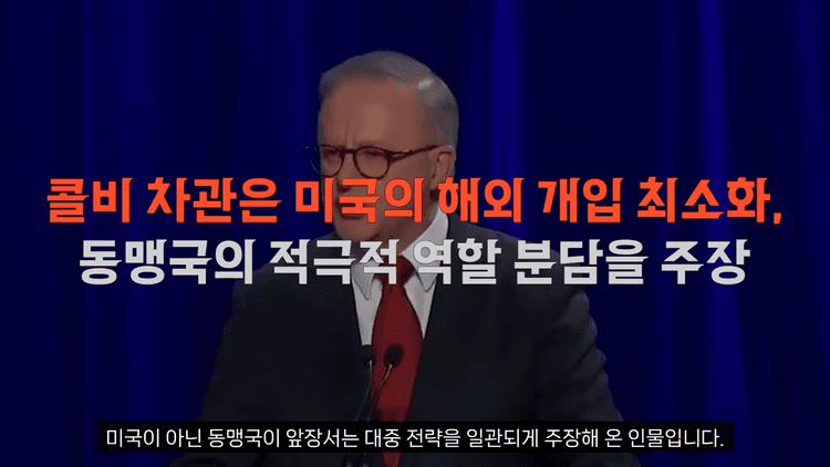 콜비 차관은 이 어젠다 아래에서 미국의 해외 개입 최소화, 중국 견제를 위한 동맹국들의 적극적인 역할 분담, 미국이 아닌 동맹국이 앞장서는 대중 전략을 일관되게 주장해온 인물입니다. 이번 일본과 호주를 상대로 한 대만 유사시 구체적 역할 요구도 바로 이 맥락에서 이루어진 것입니다.