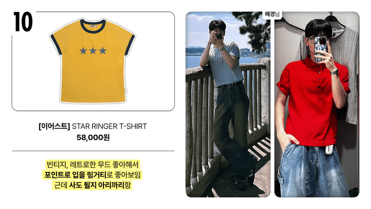 고민이 되는 제품은 구매를 한 이후에도 자주 입지 않게 될 수 있습니다. 이유는 색감이 될 수 있고, 그래픽이 될 수도 있을 것 같아요. 오히려 링거티 중에서 조금 더 빈티지한 무드를 가져갈 수 있는 펜필드 제품 혹은 별 그래픽이 예쁘게 나오는 일꼬르소 제품도 고려해보시는 걸 추천드릴게요. 만약 링거티 디자인에 빈티지 레트로 느낌을 살리고 싶으시다면, 스트라이프 티의 링거버전을 구매해보시는 것도 좋을 것 같습니다.