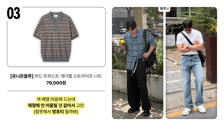 두 번째는 포커페이스 제품에 대한 고민입니다. 해당 제품은 추천할 만하지만 두께감이 있어서 한여름에는 다소 더울 수 있습니다. 비슷한 디자인과 느낌의 유니온 블루 제품이 있는데, 가격이 2-3만 원 정도 더 저렴합니다. 특정 색깔이나 디자인이 마음에 든다면 포커페이스를 선택해도 좋지만, 실용성을 고려한다면 유니온 블루도 좋은 선택입니다.