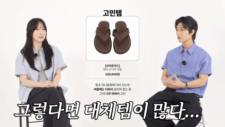 다섯 번째 고민은 24만 8천 원의 브라운 야드 레더 플립플랍입니다. 해당 제품이 특별히 마음에 든다면 상관없지만, 단순히 미니멀한 플립플랍이 필요하다면 대체할 브랜드가 많습니다. 예루살렘샌들의 제품들은 다양한 스타일로 발등을 덮어 깔끔하게 나온 스타일이 있고, 가격대도 10만 원 언더입니다. 코모레비뮤지엄의 스트랩이 두꺼운 제품도 미니멀한 룩과 잘 어울릴 것입니다.
