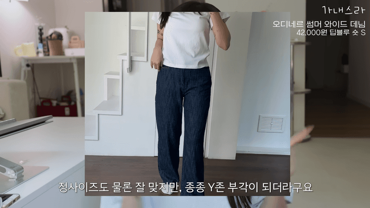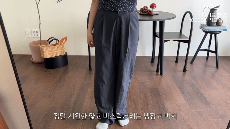여름 인생 바지를 찾았습니다. 가내스라의 제품인데, 그 전에 데님 버전도 한 번 입어봤어요. 이 제품은 썸네일 모델 핏처럼 입으려면 한 사이즈 업해서 입는 것이 좋겠습니다. 정사이즈로 입었을 때는 너무 딱 맞아서 허리 존이 가끔 부각될 때가 있기 때문에, 모델 핏으로 굉장히 헐렁하고 후들후들한 느낌으로 입으려면 1사이즈 업하는 것을 추천합니다. 너무 부들부들 얇고 여름에 입으면 정말 시원할 것 같은 두께감으로 만족스럽긴 하지만, 버니드 팬츠보다는 아쉬운 제품입니다.