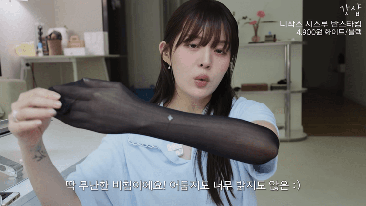 투명감 있는 시스루 스타킹도 갓샵에서 완전 가성비로 구매했는데, 비침이 딱 적당합니다. 너무 과하지도 않고 그렇다고 비침이 없는 것도 아니며, 텐션감을 살짝 내려서 신어주면 여리여리한 느낌을 연출할 수 있습니다. 이런 제품은 올이 나가면 못 신기 때문에 여러 장 구매해놓는 것이 좋습니다.