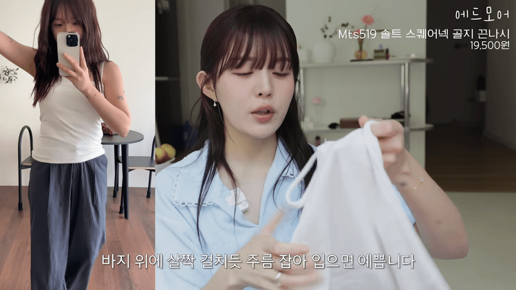 이 제품은 저의 최애 민소매인데, 너무 마음에 들어서 두가지 색상을 모두 소장한 제품입니다. 에드모어 제품인데요, 이전에도 문의가 많아서 답변을 드렸던 제품이에요. 스퀘어 핏으로 몸의 라인을 예쁘게 잡아줍니다. 노출 걱정이 없으며, 길이가 길어서 넣어 입거나, 바지 위에 걸쳐서 코디하기 좋습니다.