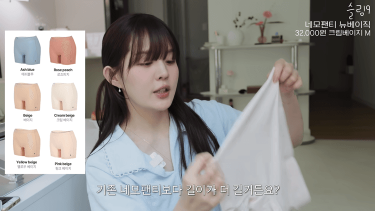 5년간 계속 입고 있는 슬립라인의 네모 팬티입니다. 여름에 스커트 입을 때 속옷과 속바지를 따로 입는 것이 귀찮았는데, 이 제품을 입고 나서는 속바지를 다 버렸습니다. 여름에는 밝은 색상을 많이 입기 때문에 베이지 컬러로 맞추는데, 이번에 뉴베이직도 나왔습니다. 뉴베이직은 길이감이 조금 더 깁니다.