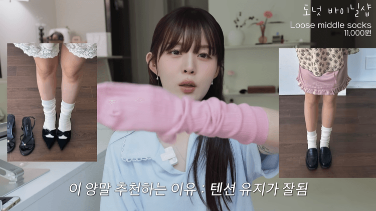 추천하는 양말은 도넛 바이닐 샵의 제품입니다. 몇 번 신고 빨아도 텐션감 유지가 잘 되고, 야들야들 여리여리한 듯하지만 끝에서 잘 잡아줍니다. 흘러내림 걱정 없이 딱 원하는 모양으로 고정시켜서 신을 수 있고, 실루엣이 굉장히 예쁩니다. 너무 부담스럽지도 헐렁하지도 않게 잡아주는 텐션감이 딱 좋습니다.