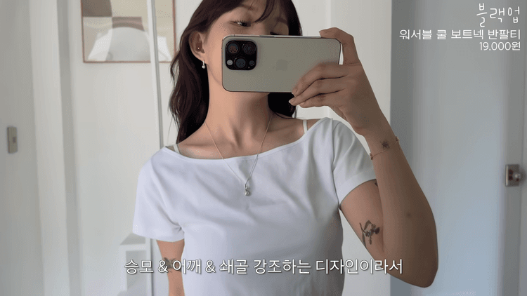 블랙업의 반팔티를 추천드리고 싶습니다. 이 제품은 승모근이 많이 올라오신 분들은 피하는 것이 좋지만, 승모근과 어깨 라인, 쇄골은 살짝 드러내면서 굉장히 후리하고 여리여리한 핏을 만들어줍니다. 어디에 입어도 예쁘고 데님 팬츠나 반바지에 걸쳤을 때 엄청 자연스럽게 연출됩니다. 그냥 옷을 대충 걸쳤는데 핏이 예뻐 보이는 느낌을 만들 수 있고, 길이가 딱 적당해서 크롭 느낌은 나지 않지만 바지에 걸쳐 입기 좋은 기장감입니다.
