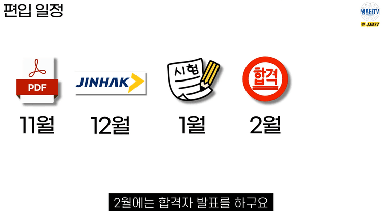 1월에는 편입 시험을 보고 2월에 합격자가 발표됩니다. 지원한 학교 중 여러 곳에 합격하면 그 중 한 곳을 선택하며, 지원하는 양이 많다보니, 예비 번호가 잘 빠져서 추가합격되는 경우도 많습니다. 이후, 3월에 3학년으로 입학합니다. 3학년에 맞는 수준으로 공부해야하기에 적응이 어렵기에, 편입 후 계획을 미리 세워두는 것을 추천드립니다.