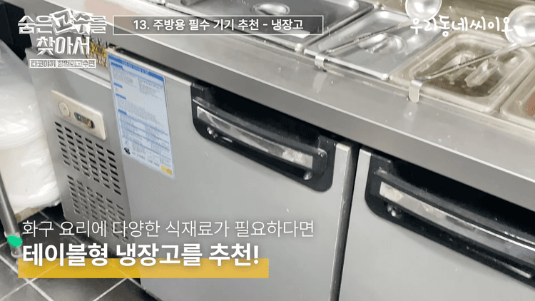 냉장고는 지속적으로 A/S가 가능한 브랜드를 선택하고, 냉동고는 나중에 추가하기 어려우므로 처음부터 충분한 용량으로 준비하는 것이 좋습니다. 화구를 요리하며 들어가는 재료가 많다면 테이블형 냉장고도 추천합니다.
