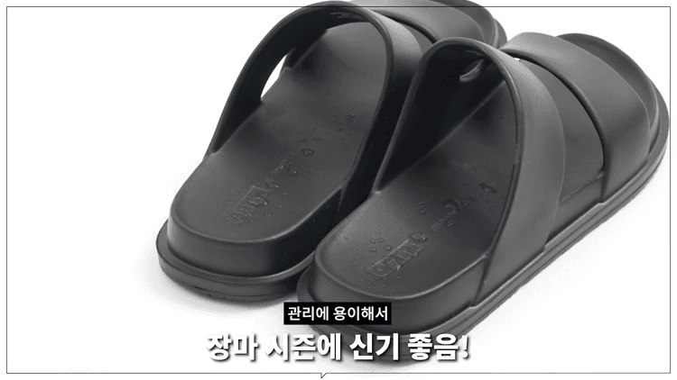 EVA 소재로 적당히 폭신하면서 착화감이 편안하고 가벼우며, 오염에 강합니다. 젖어도 금방 마르고 바닥도 미끄럽지 않게 처리되어 있습니다. 장마 시즌에는 팬츠에 이런 쪼리를 신으면 무적이라고 할 수 있습니다.