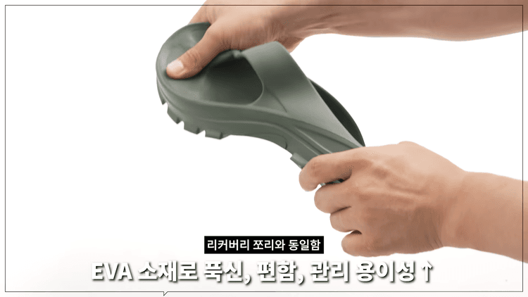 요즘 아웃도어 캠핑 감성을 좋아하시는 분들을 위한 쪼리도 있습니다. 바로 어글리 리커버리 쪼리입니다. 이 제품도 EVA 소재로 착화감이나 관리가 편하고 가벼운 것은 동일한데, 좀 더 청키한 실루엣에 아웃솔이 투박하게 들어가줘서 예쁘고 1cm 키높이 효과도 있습니다.