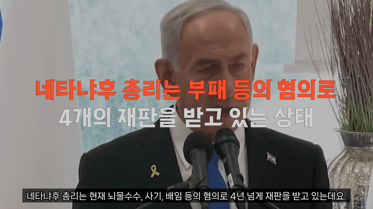 네타냐후 총리는 현재 뇌물 수수, 사기 배임 등의 혐의로 4년 넘게 재판을 받고 있습니다. 세금 우대 입법 등을 원하는 해외 사업가들로부터 20만 달러(한화로 2억 700만 원) 상당의 선물을 뇌물로 받았다는 의혹이 있습니다. 또한 네타냐후 총리 본인에게 유리한 보도를 대가로 통신 재벌에게 수억 달러에 달하는 규제 혜택을 제공했다는 혐의도 받고 있습니다. 그리고 카타르로부터 6500만 달러(한화로 945억 원)를 받았다는 혐의도 받고 있습니다.