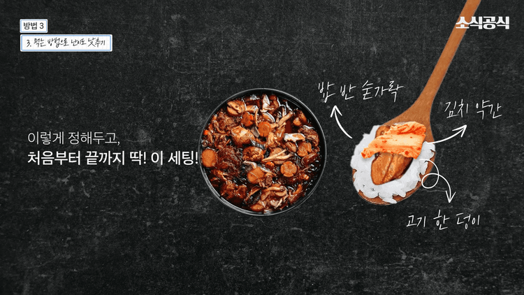 효과적인 방법은 처음부터 끝까지 같은 한 입을 지정해 두고 먹는 것입니다. 예를 들어서 찜닭집에 가서 찜닭을 먹는다면, 당면 먹었다가 김치 먹었다가 고기 먹었다가 밥 먹었다가 쌈무 먹었다가 하는 게 아니라 내 취향에 맞는 최고의 한 입을 정합니다. "나는 숟가락 위에 밥 반 숟가락에 고기 한 덩이 김치 약간" 이렇게 정해두고 처음부터 끝까지 딱 이 세팅으로만 한 입 한 입 드시는 겁니다. 당연히 그 한 입에는 온전히 맛을 최대한 느끼면서 말입니다.