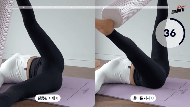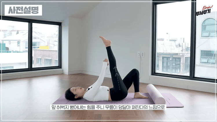 양 뒤꿈치 옆면으로 폼롤러를 잡은 상태에서 허벅지 펴지는 힘으로 무릎을 덩달아서 피는 동작