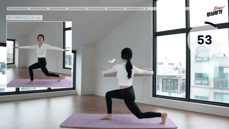 동일하게 반대방향까지 진행해주세요. 폼롤러 위에 올려둔 왼 발에 상체 무게를 최대한 실어주시오, 왼무릎이 너무 앞이나 뒤로 나가지않게 발목 위쪽에 고정한 상태에서 상체 움직임을 만들어내려고 노력해줍니다. 여유가 된다면 왼 골반을 아래로 끌어내리는 힘도 함께 유지해주세요. 오른 팔은 어깨와 비슷한 높이의 옆으로 곱게 편 상태에서 계속 유지해줍니다.