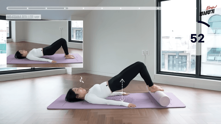 폼롤러를 가로로 발바닥 아래에 두고 양발을 주먹 간격으로 준비한 후 엉덩이를 최대한 올렸다 내리는 브릿지 동작