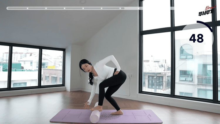 이어서 폼롤러 잡은 손을 아래로 내리고 준비합니다. 오른 다리는 왼쪽 사선으로 뒤로 움직이며 상체는 오른쪽으로 움직여주세요. 제자리 후 왼다리를 오른쪽 사선으로 움직이며 상체 왼쪽으로 움직이는 것을 반복하겠습니다. 호흡은 다리를 뒤로 보낼 때 내쉬어주세요. 상체 내려갈 때 굽어지는 것이 아니라 일자 그대로 내려갔다 올라와줍니다.