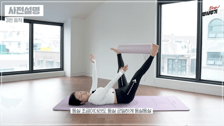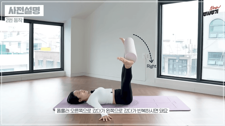 폼롤러를 잡은 상태에서 오른쪽으로 갔다가 왼쪽으로 가면서 반복합니다. 여기서 중요한 포인트는 다리를 많이 가는 것이 중요한 게 아니라, 엉덩이를 좌우 단단하게 바닥에 붙여둔 상태에서 엉덩이가 떨어지지 않는 범위까지만 다리를 왔다 갔다 움직여 주는 것입니다. 특히 오른쪽으로 이동할 때는 왼쪽 엉덩이가 뜨기 쉬워서 왼쪽 엉덩이를 바닥에 더 붙이는 힘을 주고, 왼쪽으로 넘어갔을 때는 오른 엉덩이를 최대한 붙이면서 왼쪽으로 넘어가는 힘을 주시면 안쪽 허벅지를 효과적으로 자극할 수 있습니다.