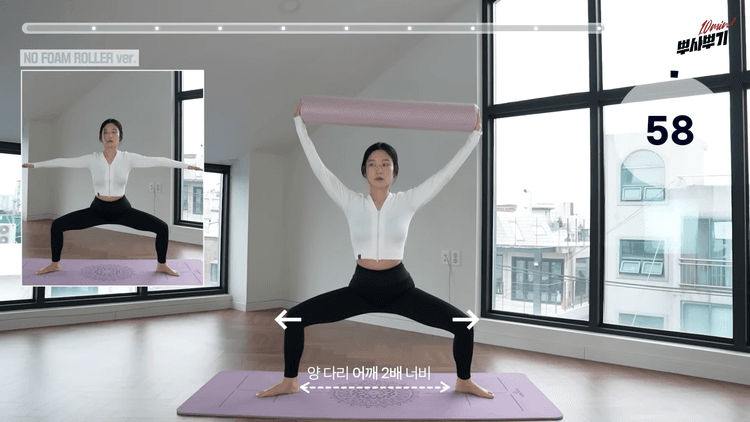 - 허리가 굽혀지지 않도록 주의양팔을 위로 만세하며 폼롤러를 잡고 와이드 스쿼트 로테이션 동작