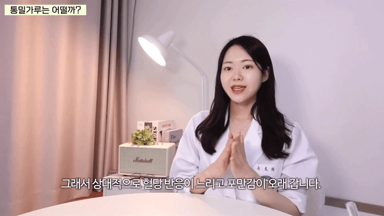 그렇다고 무제한으로 먹을 수 있느냐? 그건 또 아닙니다. 왜냐하면 탄수화물 양 자체는 백밀가루나 쌀가루랑 거의 큰 차이가 없기 때문입니다. 100g당 탄수화물 양만 보면 밀가루 76g, 쌀가루 80g, 통밀가루도 68에서 70g 정도입니다. 즉, 포만감은 더 오래 가고 혈당 반응은 완만할 수 있지만, 과량 섭취하게 되면 결국 똑같이 살이 찔 수 있다는 것입니다.