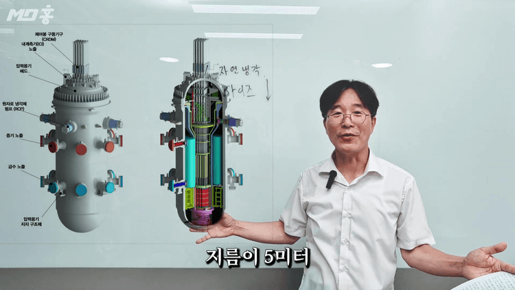 SMR의 가장 큰 특징은 자연 냉각이 가능하다는 점입니다. 기존 원자로는 엄청나게 뜨거워지기 때문에 복잡한 시스템이 필요합니다. 물 펌프로 물을 계속 순환시켜가며 냉각을 하는데, 이 펌프도 전기를 사용합니다. 만약 원자로의 전기 공급이 차단되면 원자로가 점점 뜨거워지다가 압력을 못 견디고 터지게 됩니다.